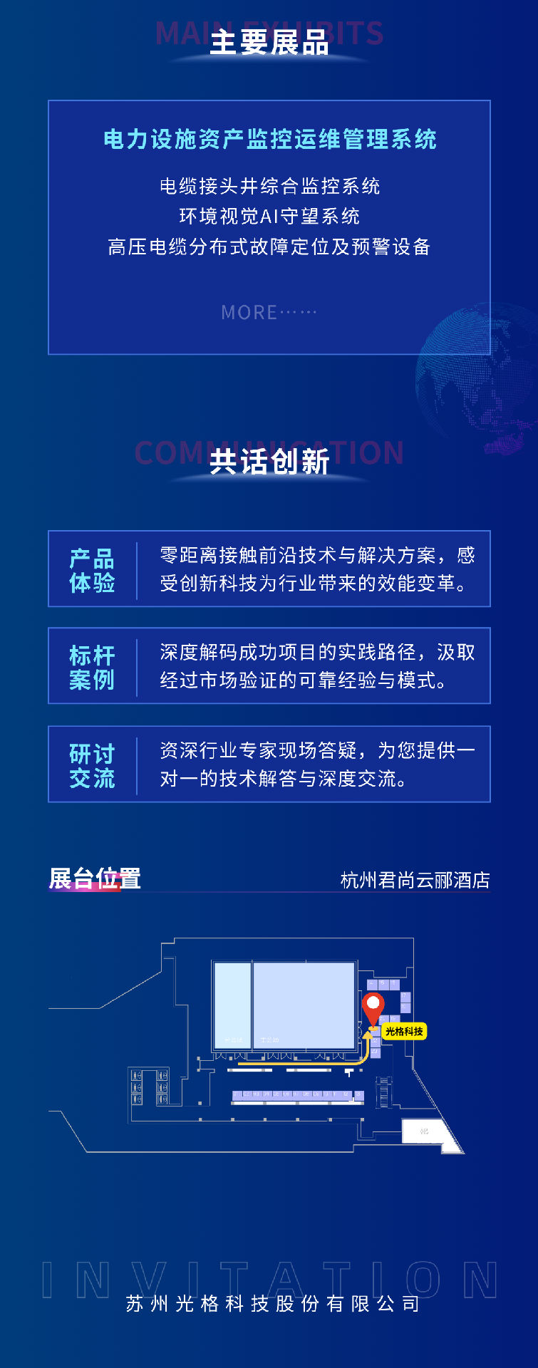 光格科技将携电力设施资产监控运维管理系统亮相大会,重点推介电缆接头井综合监控系统、环境视觉AI模型守望系统、高压电缆分布式故障定位设备等一系列创新成果。诚邀您拨冗莅临展位,交流指导,共话未来!