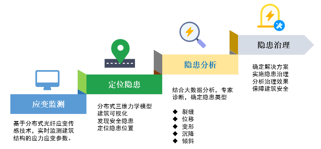 光格建筑结构健康隐患监测系统,基于分布式光纤温度应变传感技术,对建筑结构健康隐患进行实时在线监测,可及时发现安全隐患,定位隐患位置,并通过工程结构分析大数据技术确定隐患类型,如裂缝、位移、变形、沉降和倾斜等,定制专业解决方案,保障建筑安全。