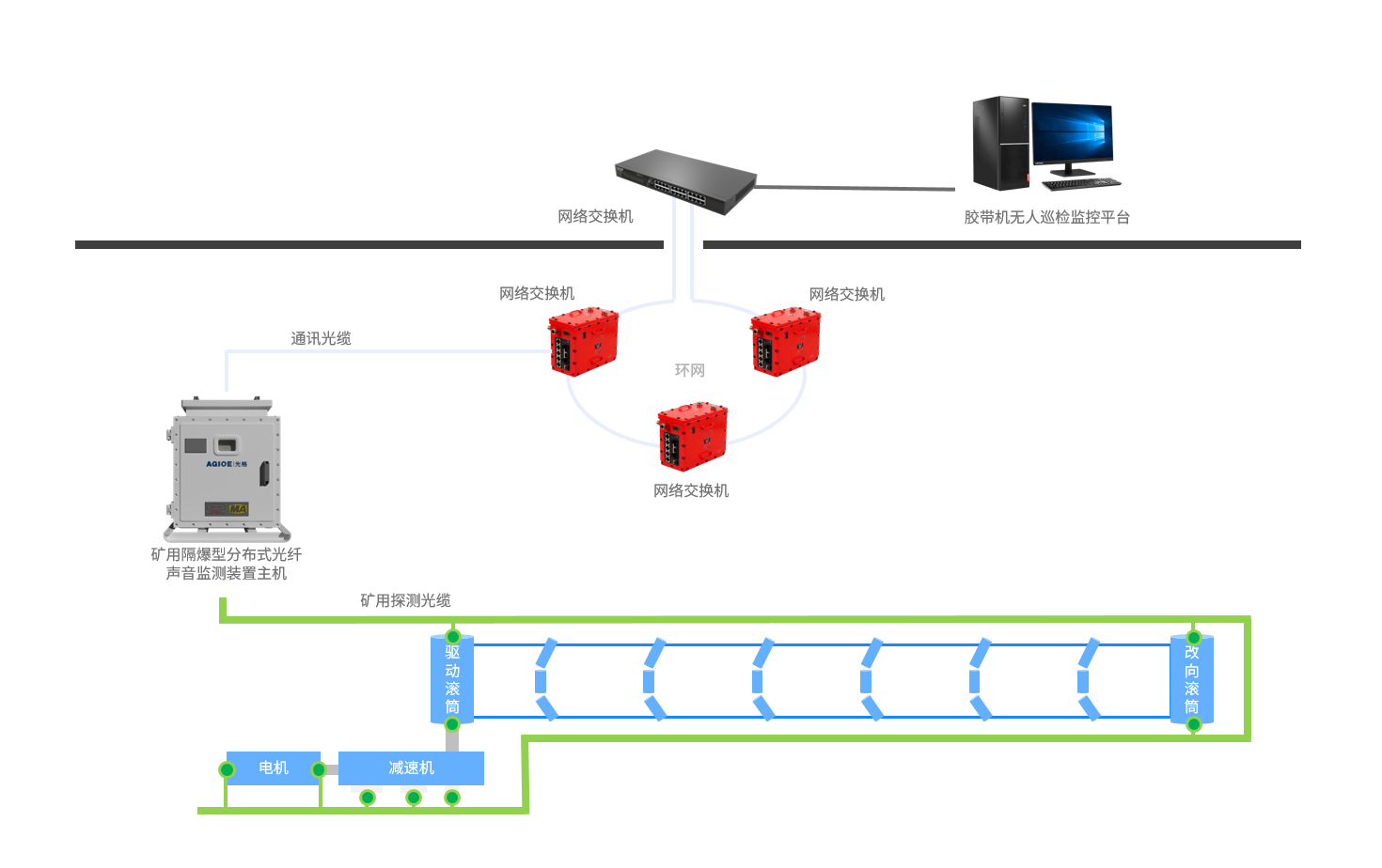 胶带机振动监测系统以分布式光纤振动与声学传感技术为核心,通过在胶带机两侧敷设探测光缆,对托辊、驱动装置、转接料斗等关键设施实现运行状态连续感知与智能诊断,为煤矿行业无人化巡检落地及主动安全防控体系构建提供核心技术支撑。