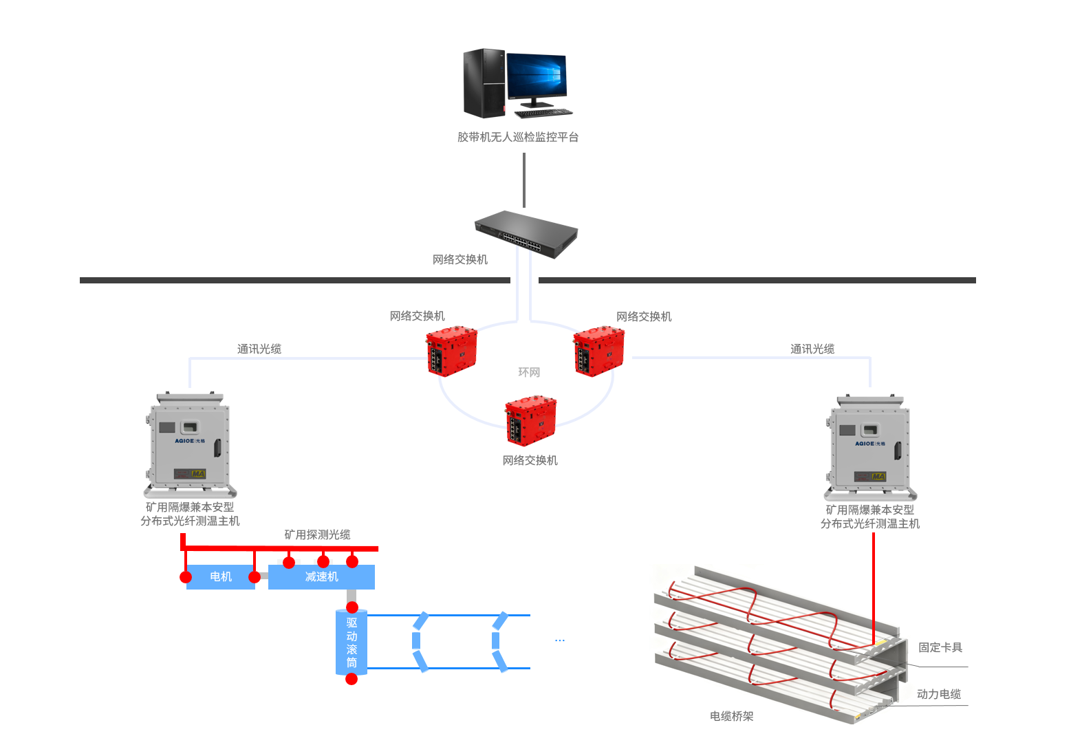 、驱动设备故障预警:测温光缆全面覆盖滚筒、电机、减速机等驱动设备关键点位,精准捕捉设备健康状态,实现故障超前预警;