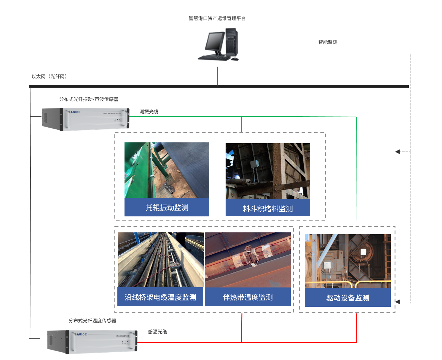 散货码头皮带机作业中,托辊、驱动设备异常、料斗积堵等故障频发,传统人工巡检效率低下、响应滞后,严重影响运输连续性。光格科技通过分布式光纤振动
