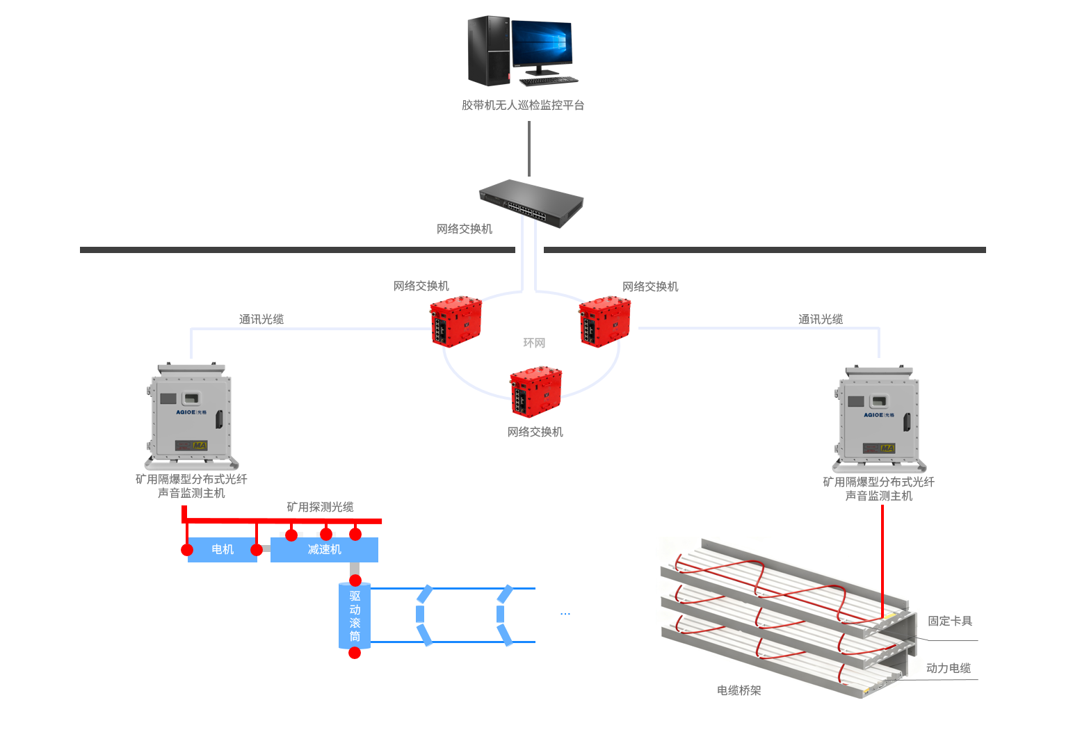 2、驱动设备故障预警:测温光缆全面覆盖滚筒、电机、减速机等驱动设备关键点位,精准捕捉设备健康状态,实现故障超前预警;